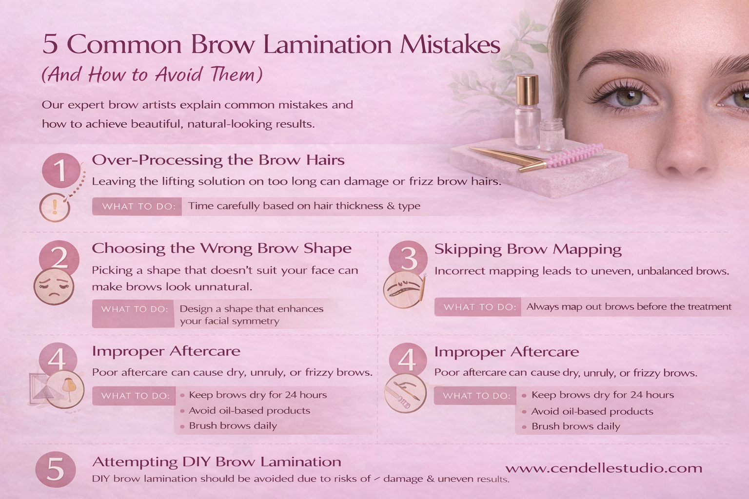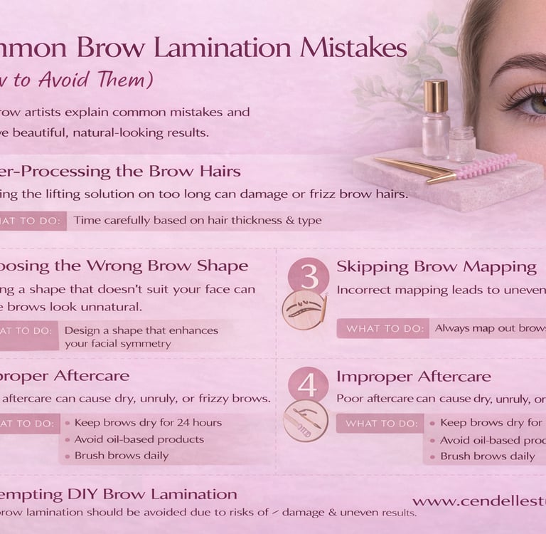 At Cendelle Studio, we believe education is key to achieving the best results. Here are the five most common brow lamination mistakes and how to avoid them.