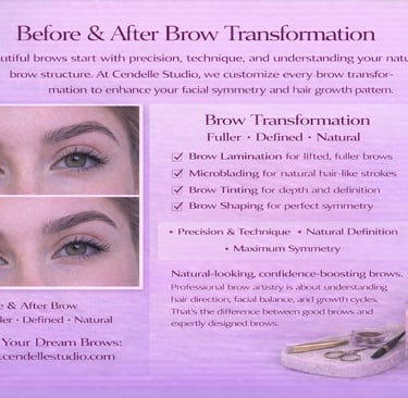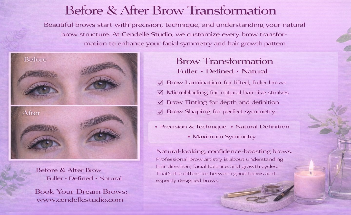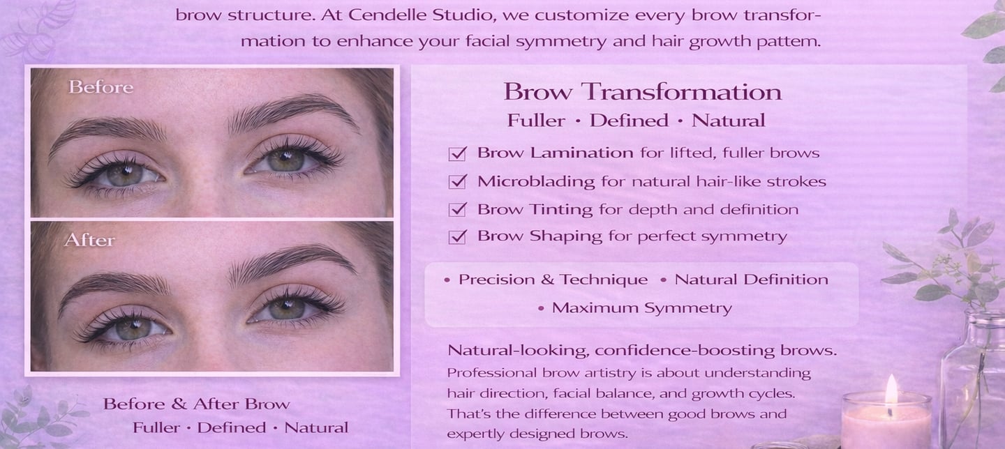 Beautiful brows are one of the most powerful features of the face. They frame your eyes, enhance facial symmetry, and create a polished, confident look. At Cendelle Studio, our brow transformations are designed to highlight your natural beauty using expert techniques and customized treatments.