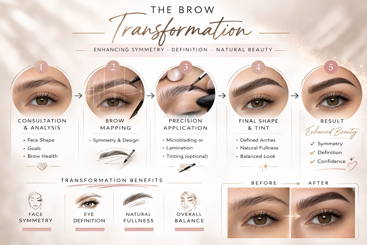 A brow transformation is a customized enhancement that may include: